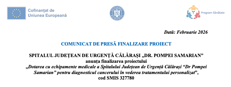 Dacă vrei să susții Spitalul Judetean de Urgenta Dr. Pompei Samarian Calarasi prin facilitatea 3,5%, completează formularul de mai jos până pe 25 mai. În acest fel, o parte din impozitul tău pe venit aferent anului trecut va fi redirecționat către Spitalul Județean de Urgenta Dr. Pompei Samarian Călărași.